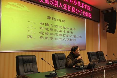 根据学校党校的统一安排,2013年12月9日,由我校商贸系党总支书记刘德刚主讲的党校第五期入党积极分子培训班专题讲座第四讲——“共产党的条件、义务和权利”在学院图书馆学术报告厅举行。