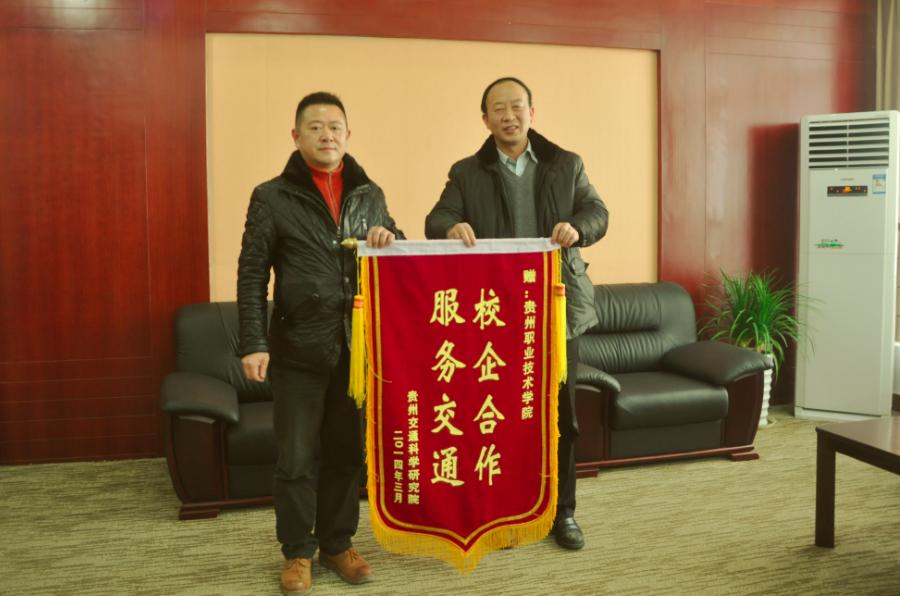 2014年3月7日,贵州省交通科学研究院罗总经理一行3人到校赠送锦旗,以感谢我院信息技术系师生去年与其在交通信息化领域的合作。我校纪委书记郭万才、信息技术系主任王道乾代表学院接受锦旗。郭书记强调了双方校企合作的意义,感谢交科院的心意,希望以后双方能在更多领域开展校企合作。王主任表示,信息技术系在校领导的指示下,会进一步加深与交科院的合作,除了在信息化领域的合作外,还要建立我院优势专业通信和网络两方面的校企合作关系。