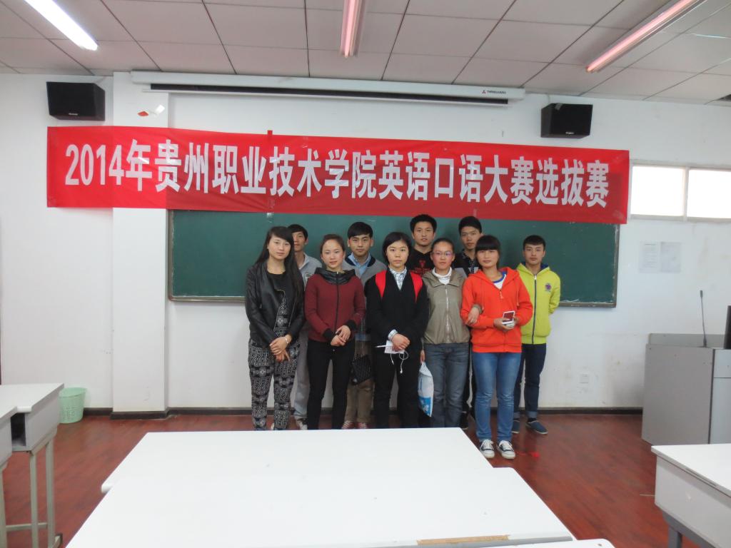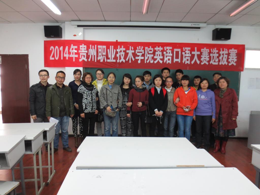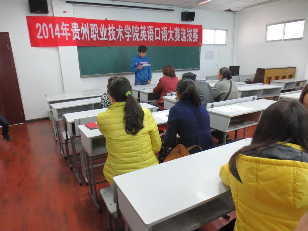 按贵州省教育厅关于举办2014年贵州省职业院校技能大赛选拔赛的通知(黔教办职成【2014】127号要求,以及学院教务处文件精神,此次大赛中的英语口语竞赛由公共基础部基础教研室负责。教研室主任朱怡蓉在英语教师中选派了8名教师参与组织此次大赛。通过教师的积极动员、组织,学院11级、12级、13级六个系有59名学生报名参加了选拔赛。2014年4月2日14:00——16:00在C709教室,贵州职业技术学院英语口语竞赛选拔赛拉开序幕。朱怡蓉、孙玲玲、李鸿强、赵春雨、付臣静、陈涛、马继伟、郑小亚、余胜映等9名老师作为评委参加了选拔赛。在这次活动中,选手先进行全英语自我介绍,然后选手们朗读了抽取的材料;最后回答主持人朱怡蓉副教授的提问。