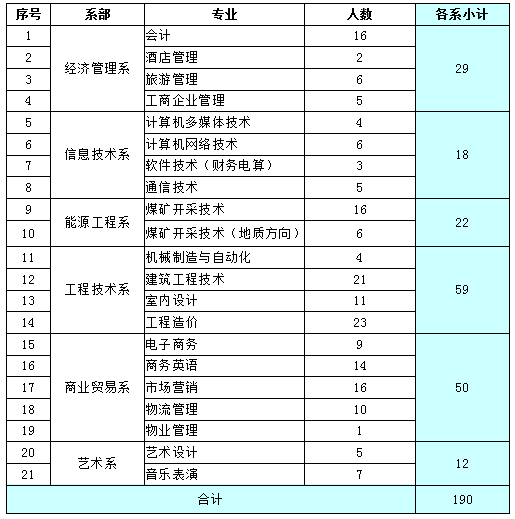 4月21日,随着招生考试院审核数据的反馈,我院2014年“专升本”考试报名工作顺利结束,此次六系共有190名2014届学生登记报考并经学生处、教务处审核合格。各系学生报名情况如下:
