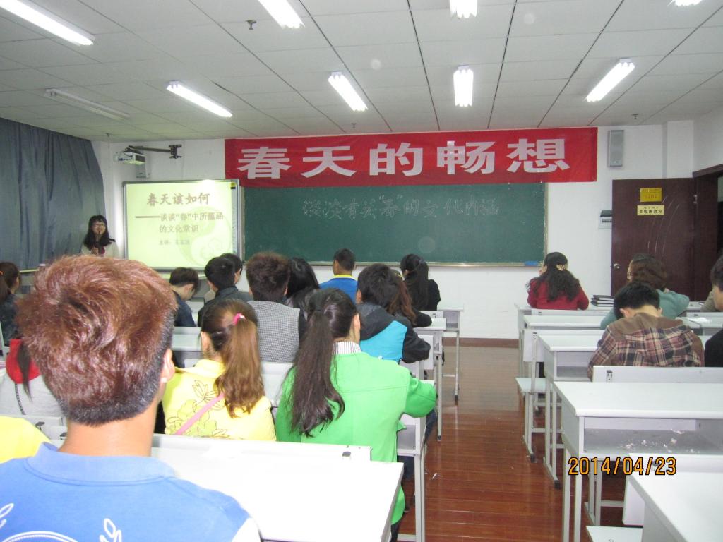 “一日之计在于晨,一年之计在于春”。4月23日14:30,公共基础部副教授王玉洁在A707教室为广大师生做了一场题为:《春天该如何--谈谈“春”所蕴含的文化常识》的讲座。王老师从“春”的字源、字形、字义讲到“春”所包含的中国文化常识,最后深入讲解了我们该如何度过春天,。在场师生反响热烈,不仅通过讲座了解了中国文化常识,而且在讲座中领悟出人生应如春天般充满生机的道理。公共基础部相关教师参加了讲座。
