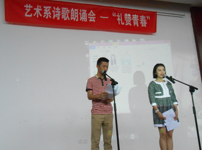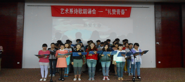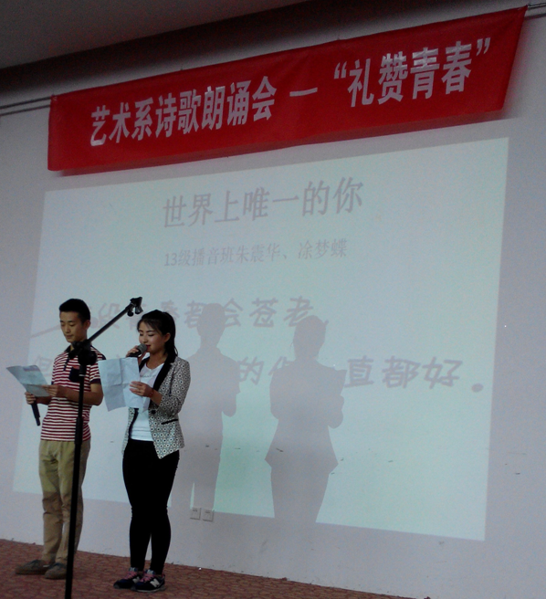 5月28日中午,艺术系团总支在行政楼九楼举办了以“礼赞青春”为主题的诗歌朗诵会,12级、13级的全体同学参加了此次朗诵会,朗诵会共有11个节目,活动形式有班级集体朗诵,组合朗诵,独诵等形式。