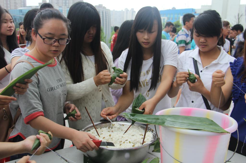 活动现场,主持人向同学们介绍端午习俗以及与粽子相关的故事。虽然活动中途天空飘起了蒙蒙细雨,但是同学们的热情并没有被细雨浇灭反而越发高涨。“包粽子”活动一开始,就引来很多学生的围观。由于大家基本上都没有做过粽子的经历,就请来了老师、宿管阿姨传授包粽子的技巧,场面甚是温馨。在老师、宿管阿姨的指导下,学生们慢慢找到了包粽子的窍门,动作也娴熟了很多。经过一个多小时的努力,一百余个粽子终于包好了,虽然粽子包的大大小小,形状各异,但看着自己亲手做的粽子,大家脸上都挂满了笑容。热腾腾的粽子一出锅同学们赶紧品尝自己的劳动成果。