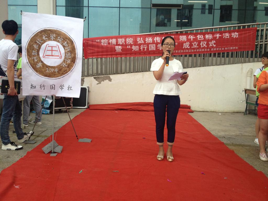 为弘扬传统文化、传播国学知识、培育大学生的社会主义核心价值观,为学生提供一个学习国学、交流国学、展示自己的平台,促进大学生思想道德建设,不断提升校园中华传统文化氛围。2014年6月4日中午12:00,贵州职业技术学院举行知行国学社成立仪式暨“粽情职院 弘扬传统”包粽子活动。此次活动是由贵州职业技术学院团委主办,贵州职院知行国学社、社团联合会承办。贵州职业技术学院团委副书记陈鹰、商贸系团总支副书记黄丽娟、团委谭璇老师出席本次活动。