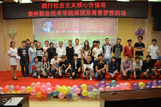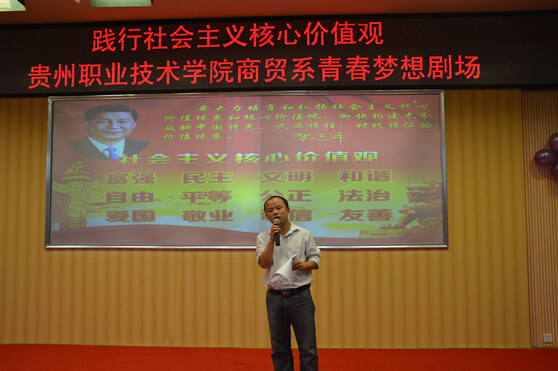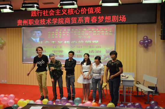 树立社会主义核心价值观,对于进一步坚定高校学生对马克思主义的信仰、社会主义的信念、改革开放和现代化的信心以及对党和政府的信任,促进社会主义制度的巩固和发展有着重要的意义和作用。为深入学习、宣传和践行社会主义核心价值观, 2014年6月20日下午15:00,贵州职业技术学院商贸系青春梦想剧场------培育和践行社会主义核心价值观小品大赛决赛在图书馆二楼报告厅如期举。此次青春梦想剧场主题为社会主义核心价值观中的富强、民主、文明、和谐、自由、平等、公正、法治、爱国、敬业、诚信、友善,抽签决定小品主题,经过前期初赛的激烈角逐,九组参赛小品进入此次的决赛。贵州职院商贸系副主任赵霖、学院团委副书记陈鹰、宣传部科长姚楠、商贸系团总支副书记黄丽娟、团委老师谭璇、商贸系辅导员万桔、汪皓萌出席并担任了本次比赛决赛评委工作。