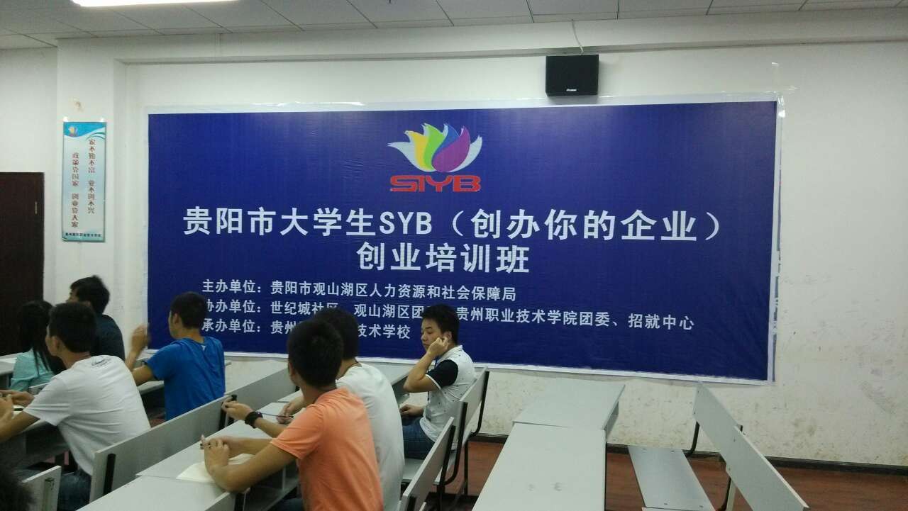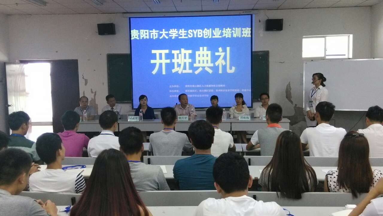 2014年7月7日上午9点,贵州职业技术学院首届SYB大学生创业培训开班典礼在教学楼A709举行。院党委委员、纪委书记郭万才、观山湖区团委副书记郭富莹、世纪城社区副主任刘晓燕、贵州震华职业技术学校校长袁玉贵、SYB国家级培训师余廷军、贵州职业技术学院招就中心副主任邓永梅、团委副书记陈鹰和首期30名学员参加了开班典礼。