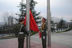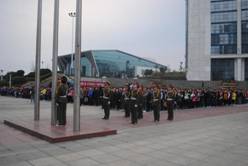 7点30分,升旗仪式准时开始。护旗队迈着整齐的步伐走向旗台,在庄严的国歌声中,五星红旗徐徐升起,在广场上空迎风飘扬。“起来,起来……”,雄壮的《国歌》点燃了同学们的爱国热情。他们昂首挺胸,心怀崇敬,神情严肃的注视着鲜艳的五星红旗,展现了职院学子朝气蓬勃的精神风貌。
