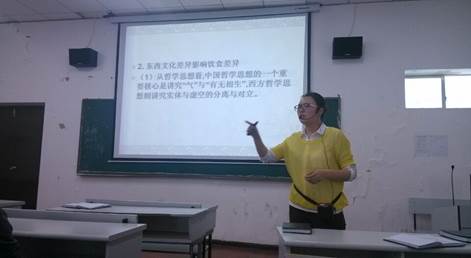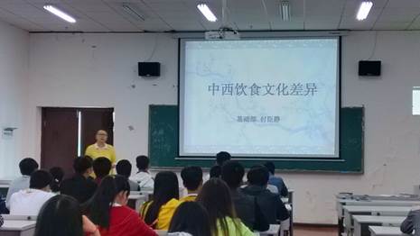 2015年4月17日下午,在学院B栋教学楼803教室,坐满了来自各系的学生,他们全神贯注地在聆听公共基础部付臣静副教授的讲座“中西饮食文化差异”。