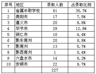 全省九个市州和省属中职校中,生源人数最多的是省属中职学校,共81人占录取总数的35.7%,其次是毕节市、安顺市。黔西南州生源只有1人。向我院推荐较多的除学院中职校外,省商业学校和安顺职高分别推荐19人和15人。