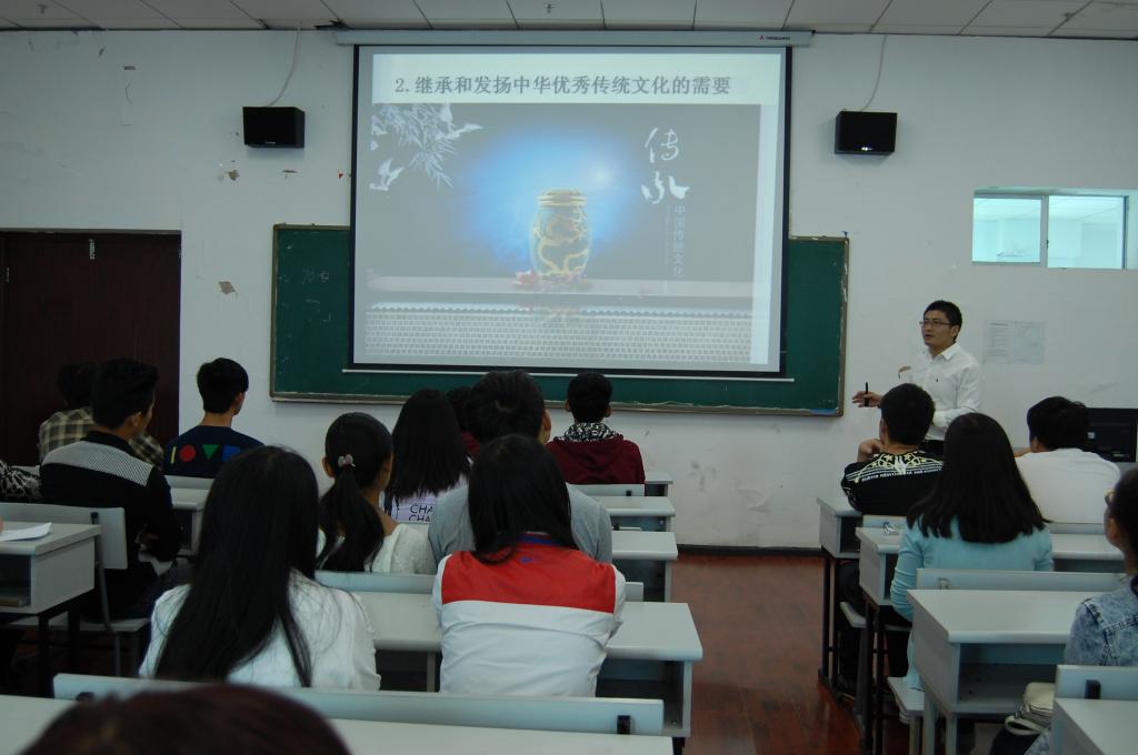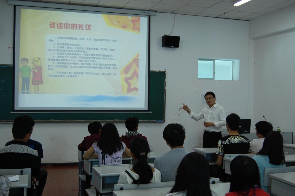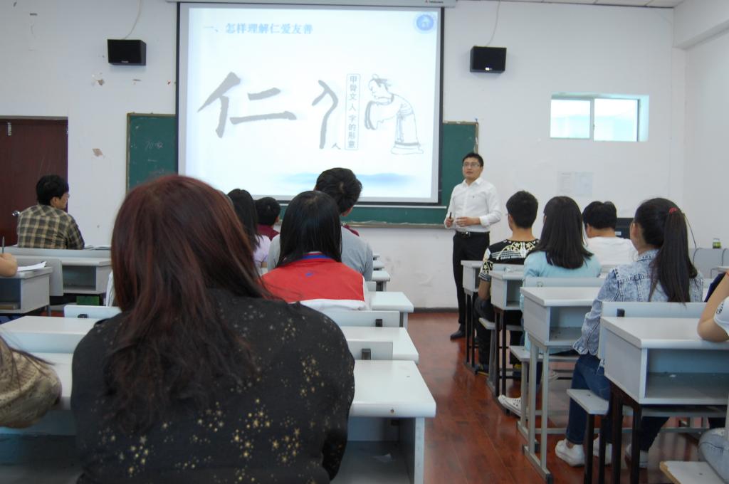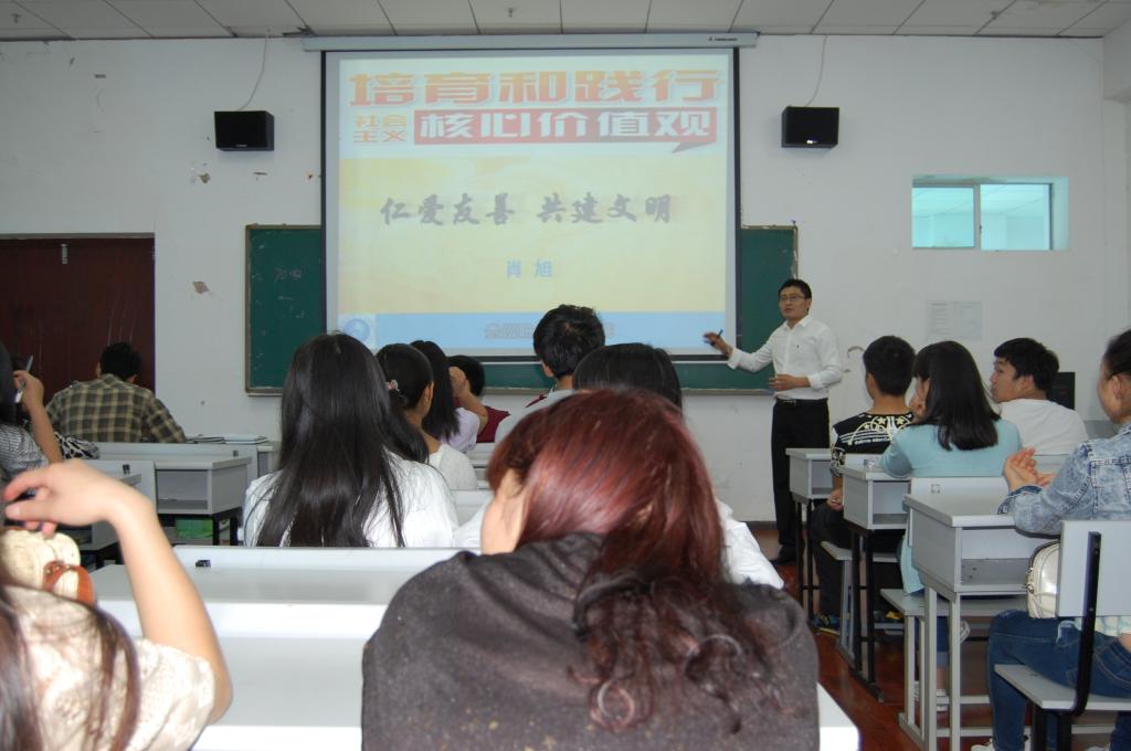 2015年5月8日下午,在学院教学楼B栋803教室,肖旭副教授作了“仁爱友善共建文明”的讲座,公共基础部主任陈国敏教授和思政教研室部分老师及各系学生参加。
