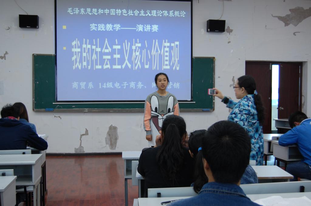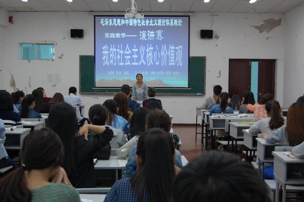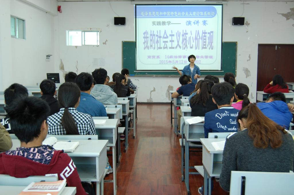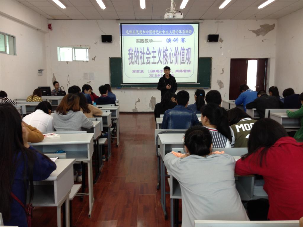 为了提高大学生对社会主义核心价值观的认识与了解,丰富思政课教学内容、活跃课堂气氛,提高学生学习思政课的兴趣。2015年5月11——16日,公共基础部承担《毛泽东思想和中国特色社会主义理论体系概论》课程的教师,按照课程实践教学计划的要求,分别在自己任课的班级开展了“我的社会主义核心价值观”演讲选拔赛,为6月学院举办的比赛做准备。