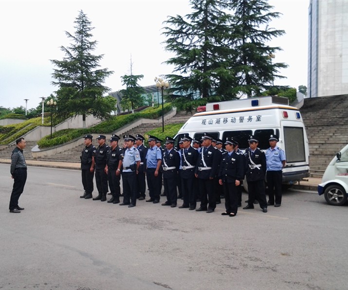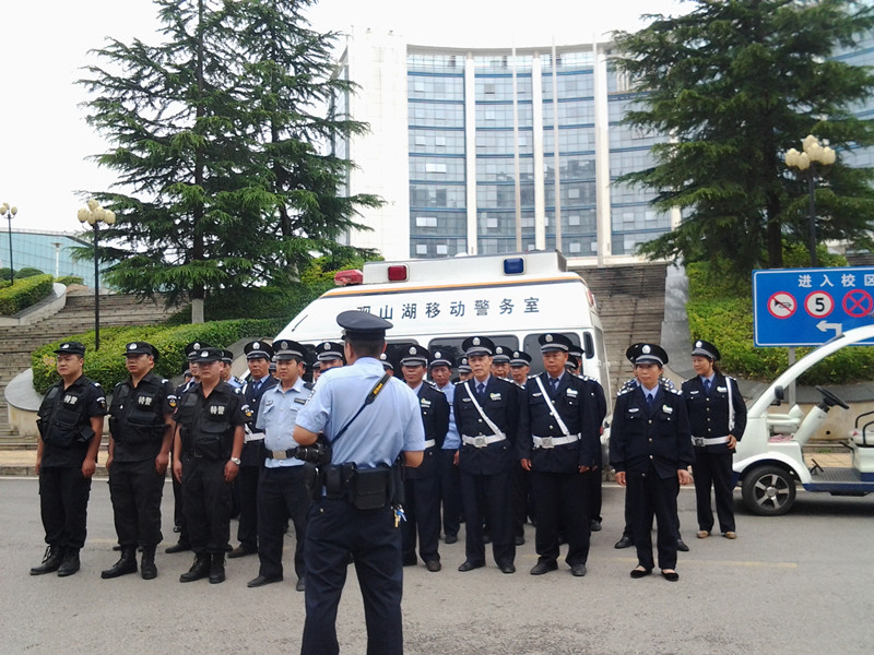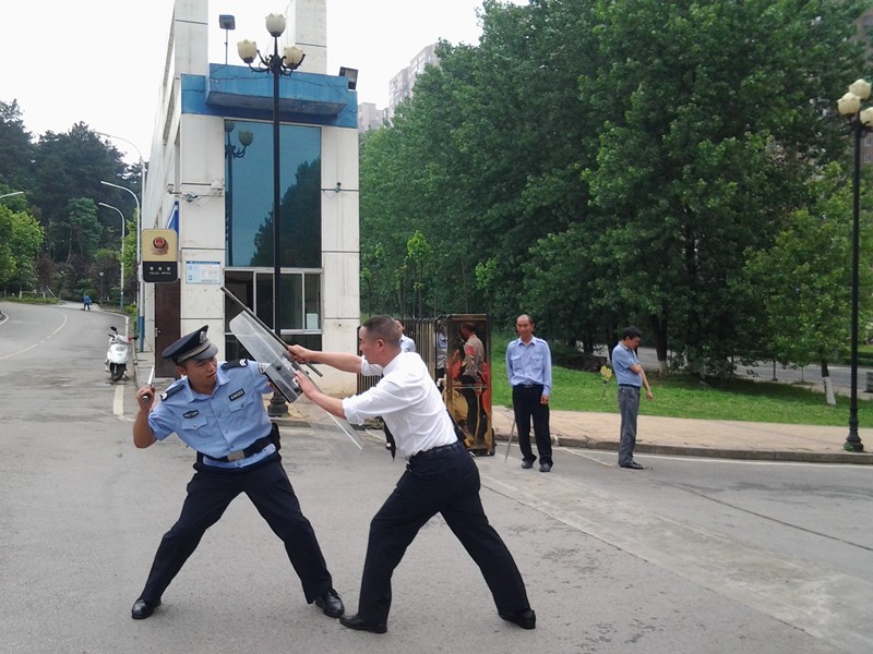 为认真贯彻落实省综治办、省公安厅、省教育厅和学校2015年校园及周边治安综合治理工作视频会议、工作计划、方案和平安校园“护校行动”等系列文件、会议精神,切实有效的预防校园反恐防暴事件的发生,进一步提高学校应急处置、反恐防暴处突工作,增加学校安保队伍的应急反应知识和团结协作精神,切实加强校园安全保卫工作,确保全校师生的生命财产安全,2015年5月19日上午,由保卫处牵头,物业公司参与,邀请贵阳市观山湖区金源派出所张雄伟警官等一行5人,组织我校安保队伍开展了“警·校”安保培训暨反恐防暴处突培训、演练。