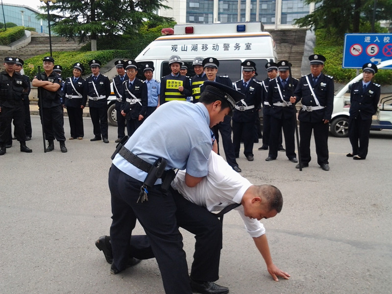 演练前,观山湖区金源派出所张警官和保卫处副处长罗文金同志首先对安保队伍进行了“警·校”安保培训。主要培训内容为:礼仪礼貌、日常巡查方法、来访登记和反恐防暴知识、应急反应能力、处置违法犯罪分子擒拿格斗的方法及注意事项和团结合作等等,张警官对反恐防暴演练中的有关注意事项做了示范。