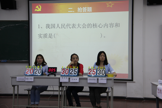 2015年5月21日下午,在我院教学楼C栋708教室,由商贸系承办的“弘扬宪法精神、建设法治中国”现场知识竞赛决赛落下帷幕。各系部分派3名同学组队参赛。莅临比赛的评委老师有:党委宣传部部长张仁俊、商贸系团总支副书记黄丽娟老师、经管系董登芬老师以及谭政华老师。