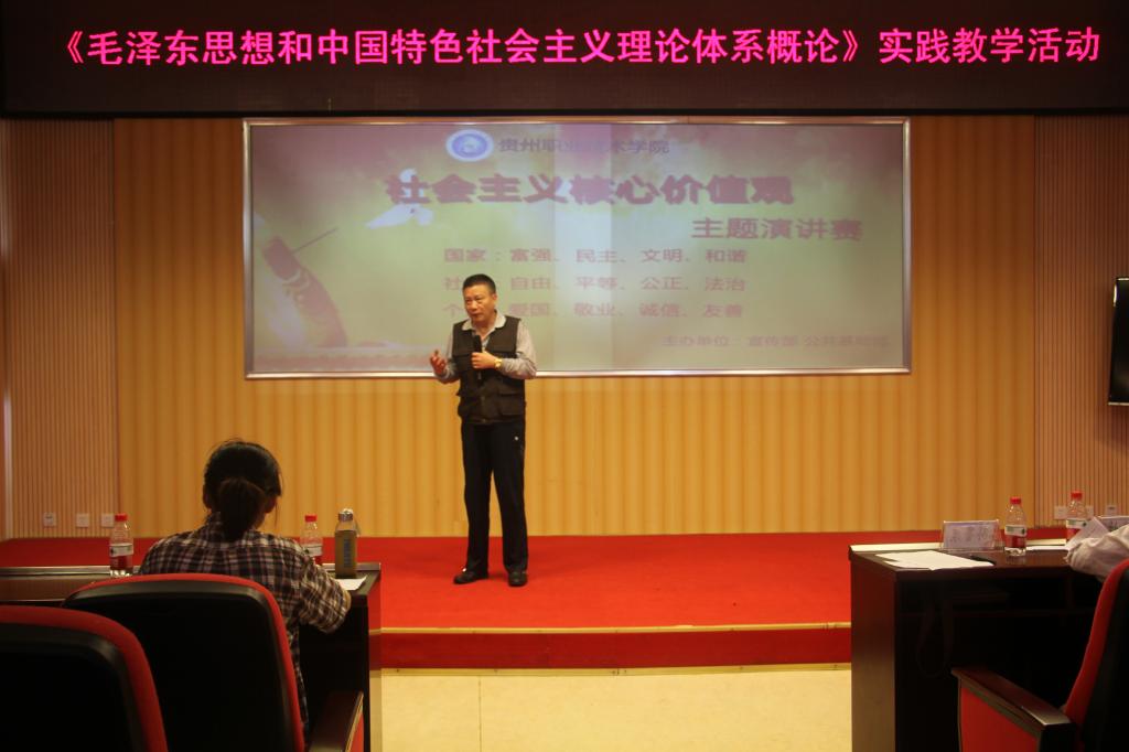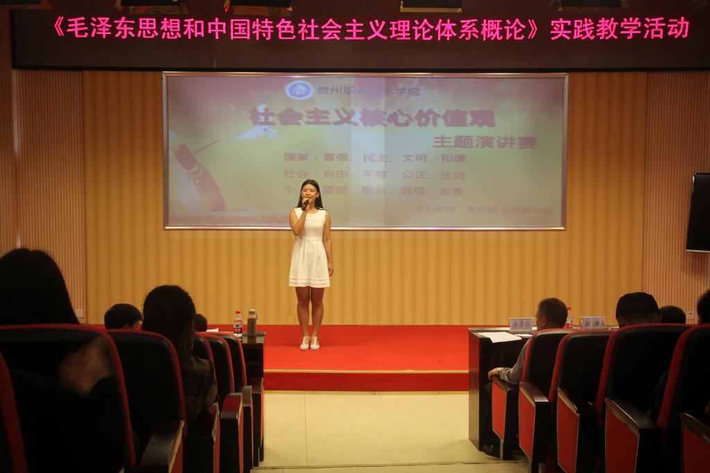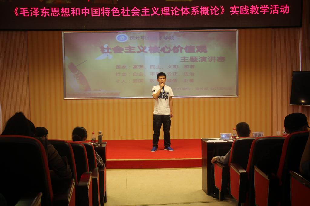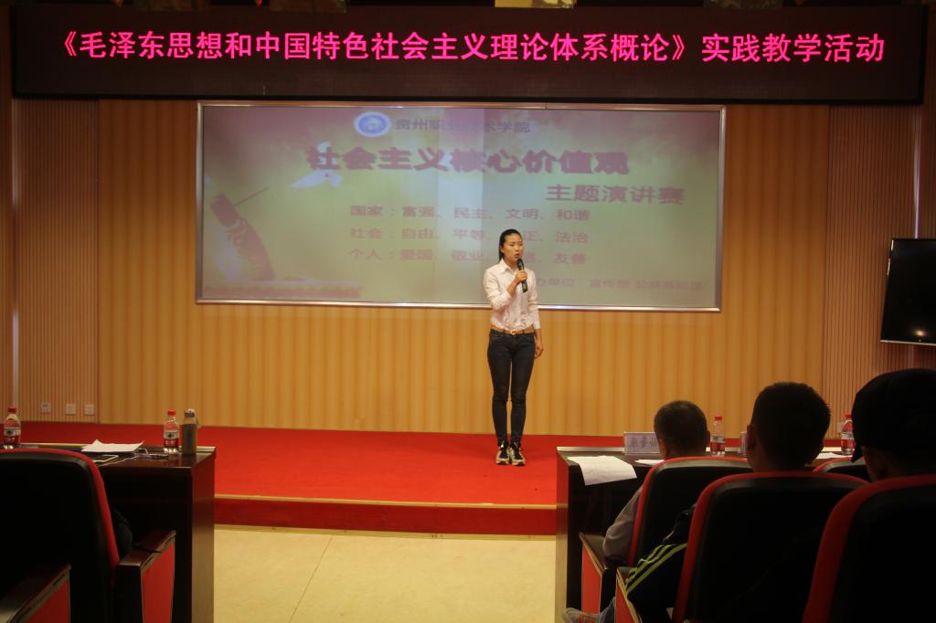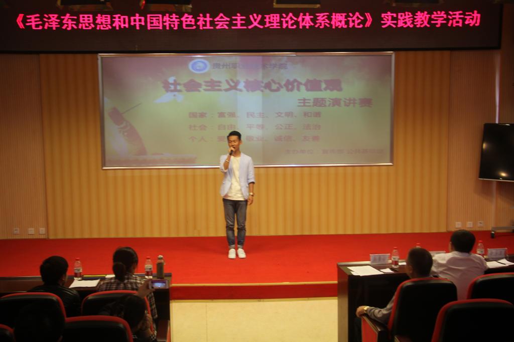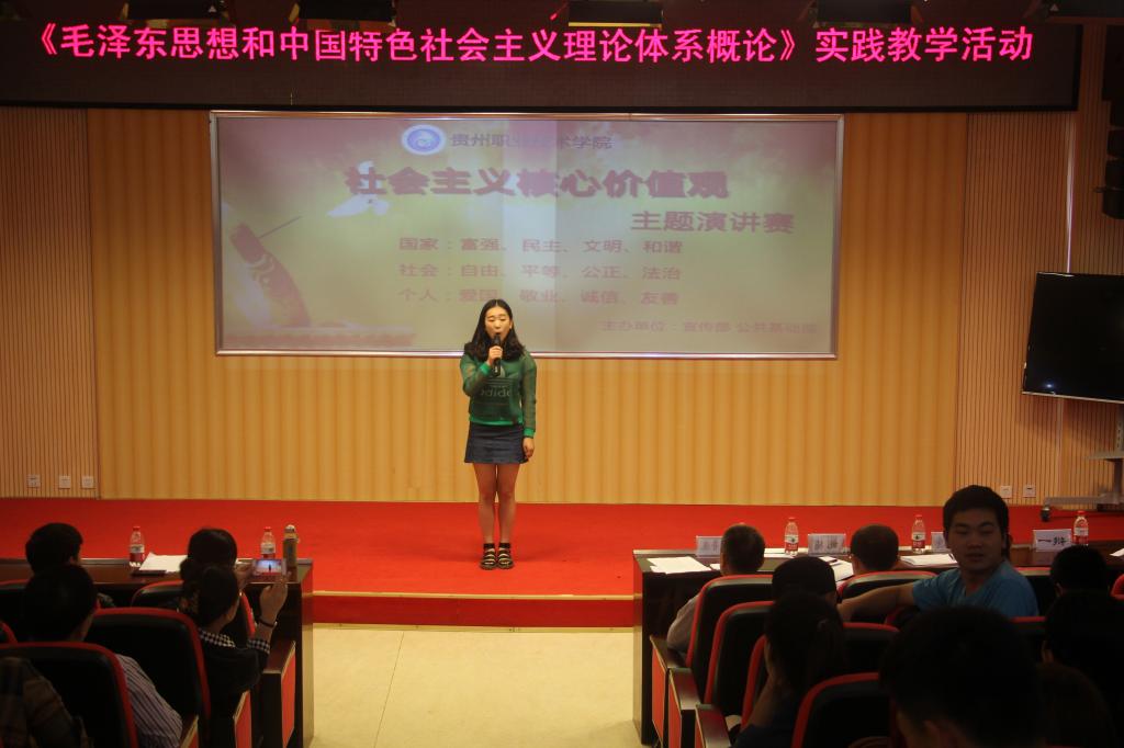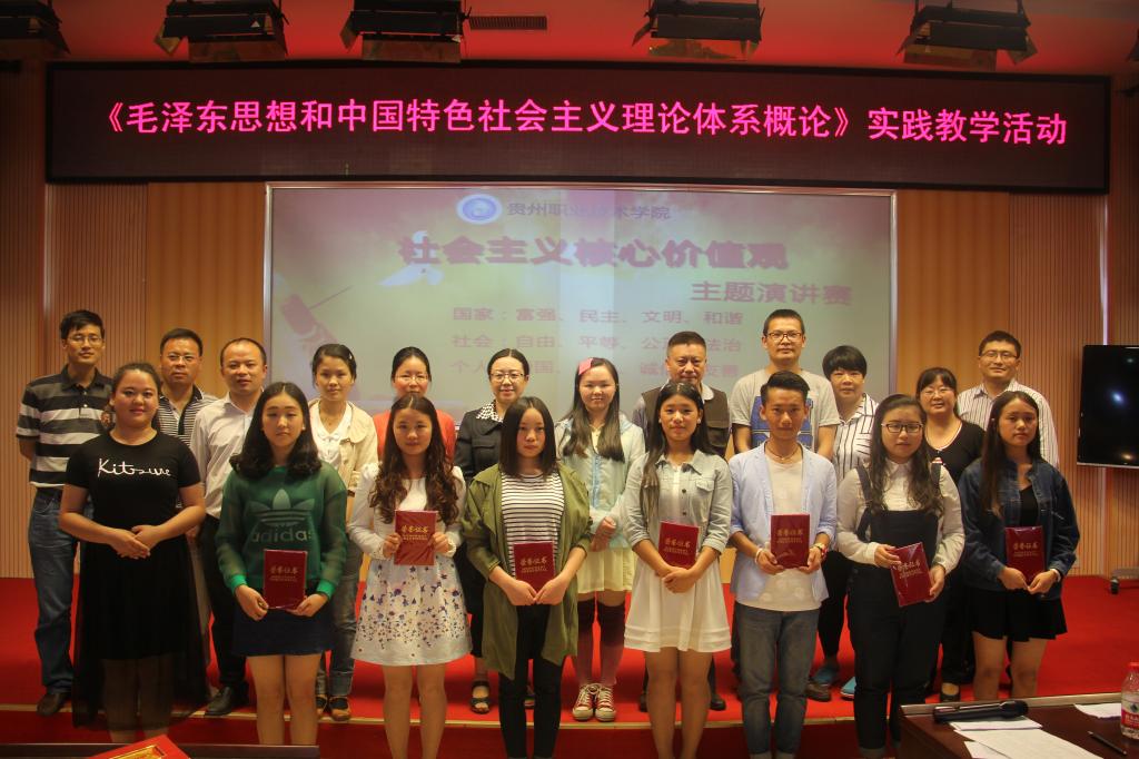 为弘扬时代主旋律,增强学生实践能力,提高学生综合素质。2015年6月5日下午,由公共基础部、宣传部主办的“学习中国特色社会主义理论●践行社会主义核心价值观”主题演讲比赛暨《毛泽东思想与中国特色社会主义理论体系概论》实践教学活动在学院图书馆二楼多功能报告厅隆重举行。评委由孙鲁痕教授、符江潮副教授、郑传春副教授、黄丹、杨小燕老师以及学院宣传部姚楠老师、团委王永峰老师担任。思政教研室全体教师及学院2014级各系300多名同学共同参加。