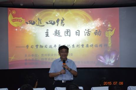 李皖院长在参与了整场活动后,指出今天的主题团日活动,主题与环节设计科学,即结合了旅游管理的专业特点,又体现了师生的思想学习生活实际,是一场有特色,很成功的活动,很受启发和教育。他向各位同学提出了三点希望:一是要志存高远、做有理想有信念的青年;二是切忌好高骛远,要脚踏实地学一技之长,以职业技能作为安生立命之本,成就辉煌人生;三是要全面发展,提高综合素质,找到自己人生的准确定位,实现自己的人生价值。