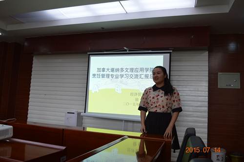 徐倩老师是经管系新进教师中的翘楚,由于自身的勤奋努力和优异的外语交流能力,特受学校委派于2015年3月至4月到与我校合作办学的加拿大堪纳多文理应用学院进行为期2个月的交流学习。本次心得报告会上,徐倩老师以多媒体展示和讲解的形式,从加校的学院概况、教学开展、课程设置、实训条件、教学特色、师资力量及个人收获等方面为系部全体教职工展示了她的学习成果。