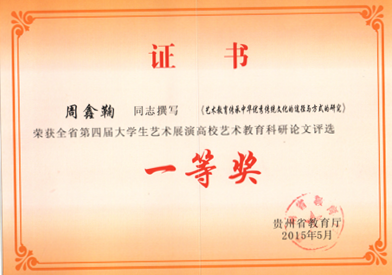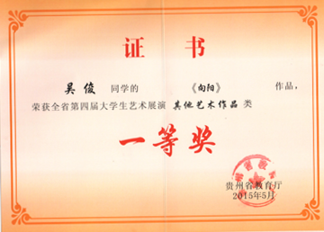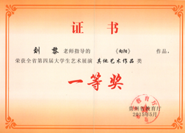 贵州省第四届大学生艺术展演活动圆满结束,艺术系周鑫鞠老师撰写的论文《艺术教育传承中国传统文化的途径与方式的研究》,荣获高校艺术教育科研论文一等奖;由刘黎老师指导的2012级艺术设计班学生吴俊同学的装饰绘画作品《向阳》,荣获艺术展演一等奖。