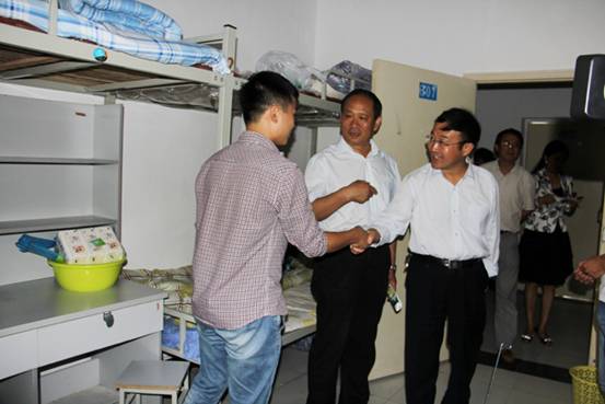 随后,邓惠宾书记、李皖校长来到学生生活区,检查学校迎新期间的后勤保障情况,对学生志愿者在迎新期间热情服务新生给予高度赞赏,希望他们在以后的学习和生活中,继续发挥学长的示范带头作用,努力营造积极向上、奋发有为的良好校园氛围。在新生公寓,校领导与新生亲切交流,鼓励新生要迅速适应大学生活,制定好大学奋斗目标,以崭新的精神面貌投入到大学的学习和生活中去。