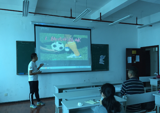 潘老师说课的题目是:双手胸前传接球技术,蒋老师说课的题目是:足球脚内侧传球技术。两位老师根据说课的要求和内容,做了充分的准备,详细做了ppt,从视频导入,经典比赛呈现,再到说课内容的铺开,逐渐引出本次课的主题、内容、重难点,深入浅出。潘廷优老师根据说课内容,分成三个部分即说教材、说教学方法、说教学过程,一步步深入讲解、分析,确定教学内容在教材中的地位和作用,同时,明确教学对象,根据学生的特点和心理,确定教学方法和教学过程,在深入分析教材和学情后,确定教学目标、教学重难点、教学方法,逐步深入,形成从无球练习—有球练习—完整练习等的教学过程,引导学生学会发现问题---思考、分析问题—解决问题,提高学生的实践能力和解决问题的能力。