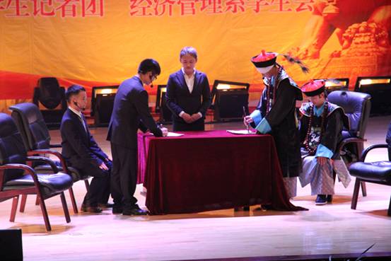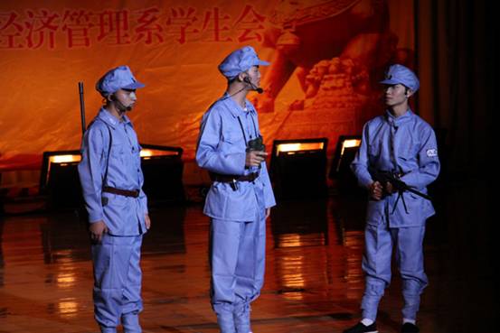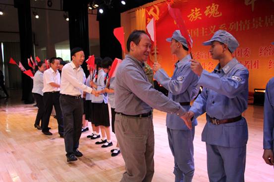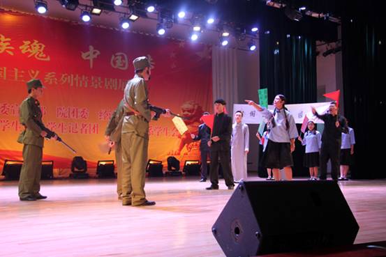 为隆重纪念中国人民抗日战争暨世界反法西斯战争胜利70周年,引导广大师生铭记历史、缅怀先烈、珍爱和平、开创未来,为中华民族伟大复兴而加倍努力,2015年9月15日、18日、21日,我校在礼堂举办了以“民族魂·中国梦”为主题的爱国主义系列情景剧展演。本次展演由党委宣传部、团委、经管系主办,校学生会、学生记者团、经管系学生会承办。学校党委书记邓惠宾,党委委员、副校长龚辉,党委委员、纪委书记郭万才,党委委员、副校长徐伟、李勤、相关部门负责人及2015级新生2700余人观看演出。