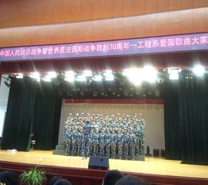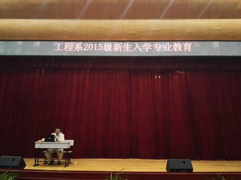 大会开始前,为纪念中国反法西斯抗战胜利70周年,特派优秀辅导员刘佳蓉老师为新同学们高歌演奏了一曲抗战之歌。随后,工程系50位优秀新生代表也在台上给大家带来了两首军训战歌,他们热情奔放、他们激情澎湃,把大会气氛拉上第一个高潮点。看着台上同学们的精彩表演,台下的同学和老师们也在他们的带动下,纷纷起立,一起歌唱,足以显现出工程系师生的高昂斗志。随后,工程系的各位老师及辅导员一一上台和新同学们见面,简单介绍了老师们的个人信息,所带专业以及所带班级。同时韩主任也向新生们提出了四个要求:1、要获得母校的文凭;2、要学到实用的技能;3、要锻炼独立的人格;4、要珍惜同学的友谊。并祝愿工程系所有新同学都能在这度过一个充实而又愉快的大学生活!