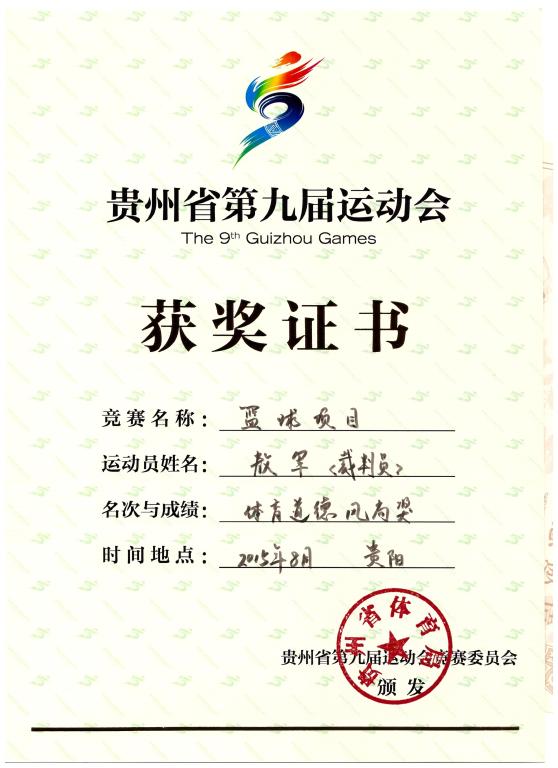 省运会是我省赛事级别最高的运动赛事,此次全省第九届运动会也是停办23年以来,竞赛项目设置最全、参赛人数最多、群众参与度最高的综合性体育盛会。我院教师敖军副教授参与了本届省运会篮球裁判工作,并分别担任了职工组、大学生组、公开组、青少年组四个组别篮球赛的裁判长,圆满完成了相关工作,最终荣获了由贵州省体育局颁发的贵州省第九届运动会篮球项目体育道德风尚裁判员,为我院挣得了荣誉。