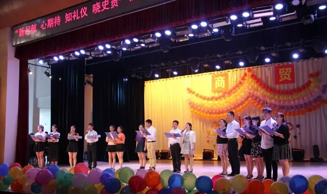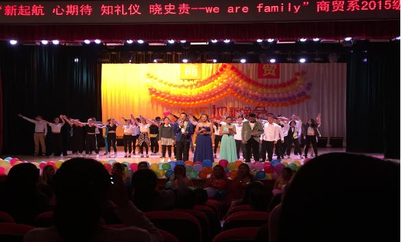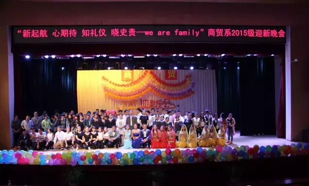 2015年10月16日下午14:00,商贸系迎新晚会在学院大礼堂举行。商贸系联系领导党委书记邓惠宾老师,宣传部副部长、团委副书记陈鹰老师观看了此次晚会,商贸系党总支书记刘德刚老师,系副主任赵霖老师也带领全系教职工到场观看。