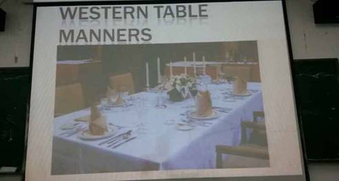 参加讲座的同学对西方餐桌礼仪表现出极大的兴趣,他们对由于中西方所处的自然环境和劳动方式的不同,中西方在餐饮礼仪方面的许多差别有了一定的了解对西方文化主张的个人荣誉、自我中心、创新精神和个性自由等有了一定的认识。