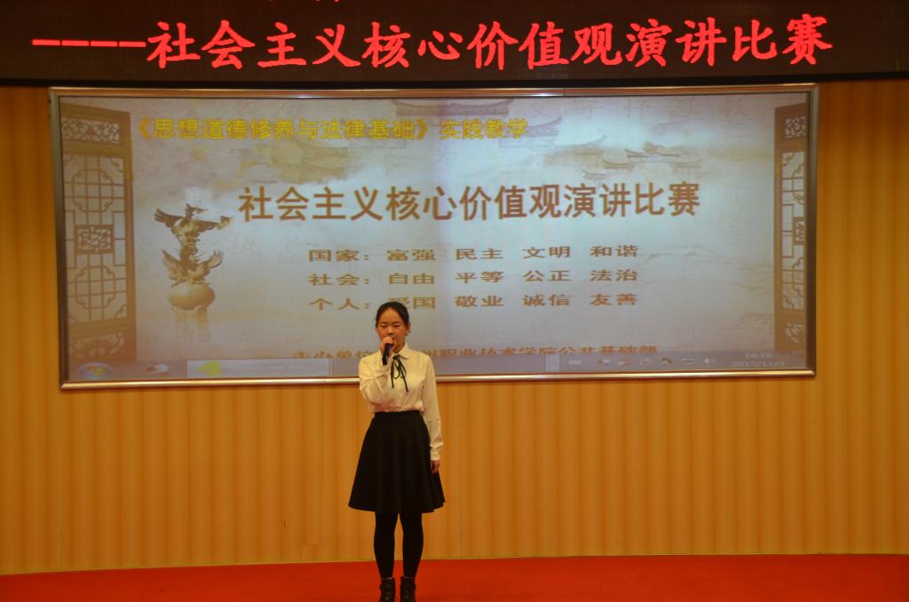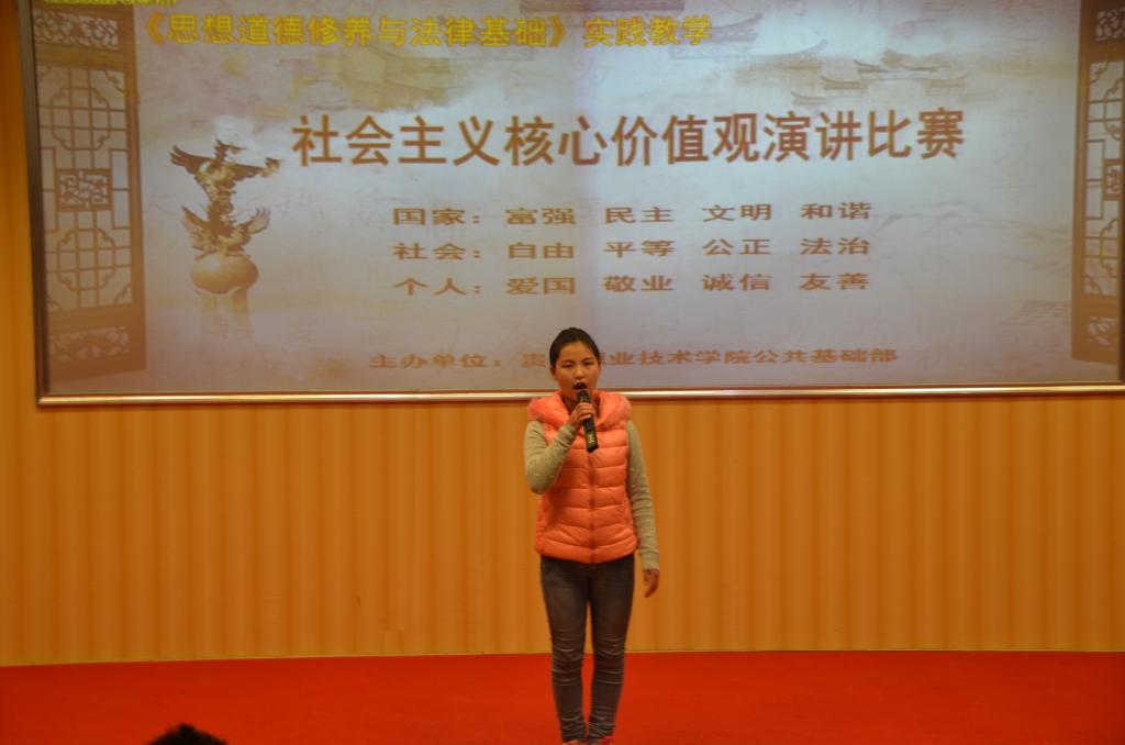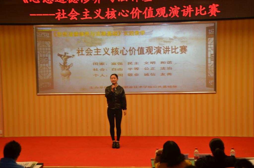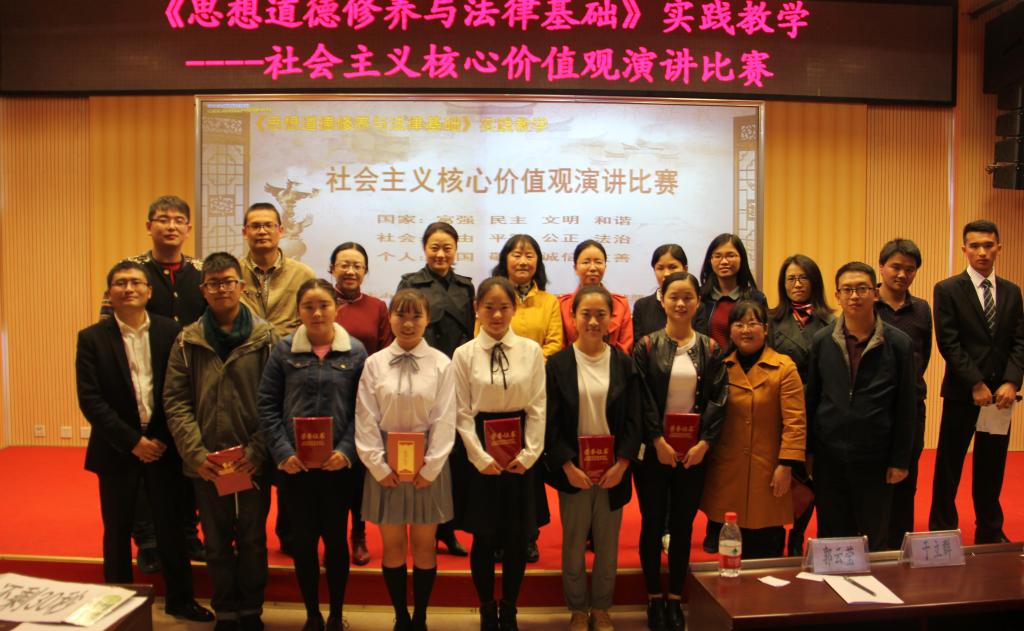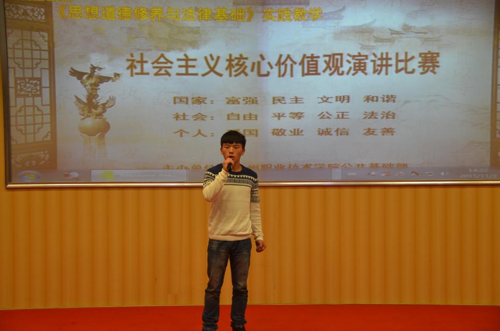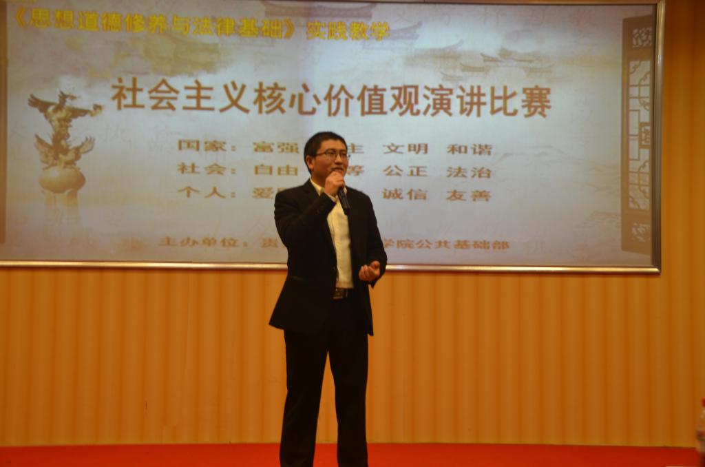 为了提高比赛的质量,本学期承担《思想道德修养与法律基础》课程的老师在授课班级进行了初赛,每个大班选拔一名选手参加比赛。通过比赛这种实践教学活动,增强了同学们对社会主义核心价值观的理解,丰富了思政课实践教学的形式,锻炼了同学们的语言表达、文字组织以及临场应变能力。比赛现场成为传递正能量的场所,延伸了思政课的教学阵地,加深了同学们对社会主义核心价值观“24字”的理解,激发了同学们践行社会主义核心价值观的主动性。