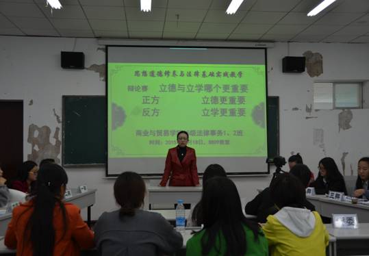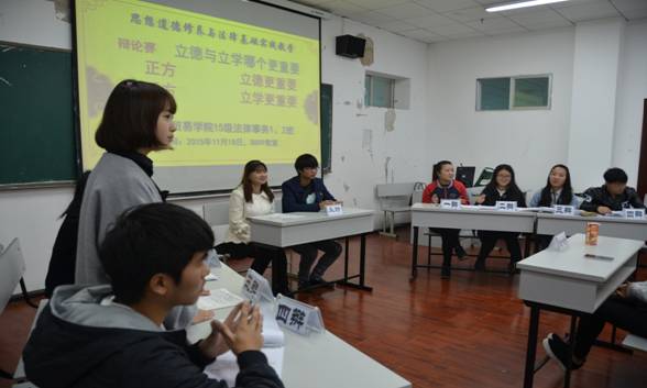 2015年11月18日在教学楼B809教室,《思想道德修养与法律基础》课程教学实践——辩论赛正在激烈而紧张地进行。此次辩论赛的主题是“立德与立学哪个更重要”,商业与贸易学院电子商务1、2班、法律事务1、2班的同学分别开展了两场辩论赛。“立德与立学哪个更重要”是紧紧围绕《思想道德修养与法律基础》课程的中心思想,针对高职学生中存在的轻视品德修养的现象,认为高职学生只要学好专业知识,有一技之长就能够有一个美好的前程。