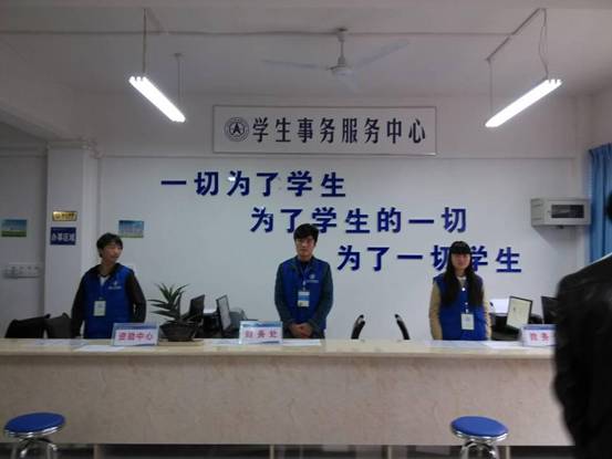 遵义职业技术学院:“中心”有实体,整体布局美观整洁、大厅开阔。2014年10月开始运营,有9个部门入驻,已接待前来办理事务的学生3000余人次,学生普遍反映好。中心还引入了快递、驾校、照相、复印、电信等社会服务机构为学生提供服务。