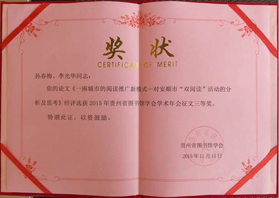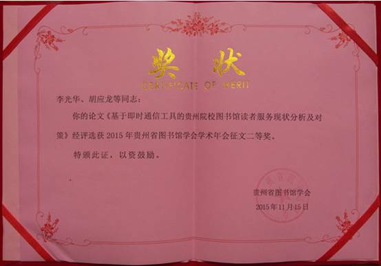 我院图书馆李光华的论文《基于即时通信工具的贵州院校图书馆读者服务现状分析及对策》获本次学术年会征文二等奖并在年会上交流,另一篇《一座城市的阅读推广新模式—对安顺市“双阅读”活动的分析及思考》(第二作者)获三等奖。