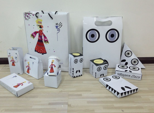 艺术设计专业的课程实物化是对每门专业课程的要求,是对教师教学、学生评价和考核的重要指标。《包装设计》课程共计80学时,作业汇报展展出了全班34位同学的作业,检验了课程教学的成果。同学们的设计以不同的主题,运用各种设计元素,体现了同学们丰富的想象力和一定的手绘、电脑设计操作能力,虽然还比较稚嫩,但已经体现出一定的设计理念如对民族元素的应用和一定的市场意识。