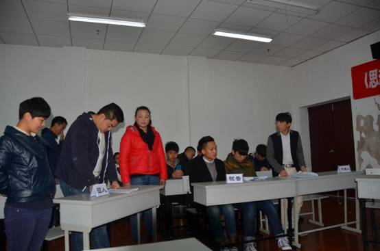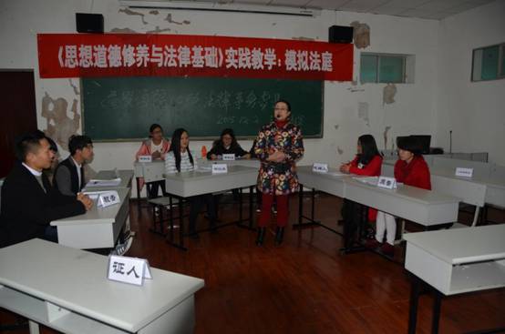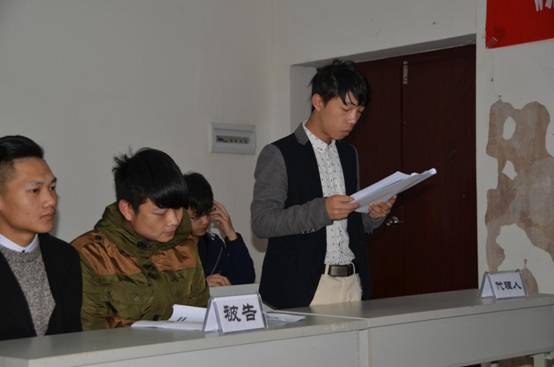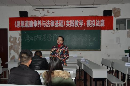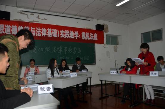 2015年12月2日上午,在学院B栋教学楼809教室,商业与贸易学院15级法律事务专业、电子商务专业的《思想道德修养与法律基础》课程实践教学——模拟法庭正在进行。教室被布置为法庭,审判长、审判员、书记员、代理人、被告、原告、证人、法警、人民陪审员一应俱全。