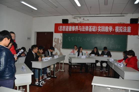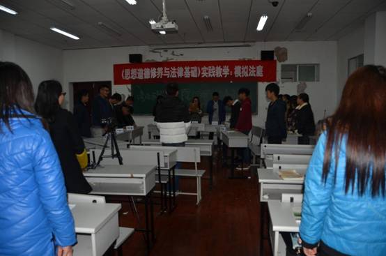 《思想道德修养与法律基础》课程授课教师陈国敏组织这次模拟法庭的目的主要是让学生了解法院民事审判制度,通过了解并参与民事诉讼的审理过程,进一步学习相关法律法规如《劳动法》,《合同法》等;对程序问题有了更深刻的理解。在模拟法庭现场,同学们积极地在尽力地扮演好自己的角色,首先书记员沉稳的走向书记员台,宣布公诉人、辩护人入庭,询问确认到庭情况,然后宣布法庭纪律,接着是审判组法官出庭并宣布庭审开始,进行法庭调查、法庭辩论、宣判等法定程序,模拟法庭的庭审就此划上了句号。