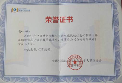 2015年11月6-9日,由国家教育部主办的2015年“凤凰创壹杯”全国职业院校信息化教学大赛在南京高等职业技术学校举行。我院工程技术系孙一平老师经过紧张而激烈的角逐,参赛作品《凸轮轮廓设计》获高职组信息化课堂教学比赛三等奖。