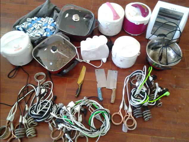 各检查人员深入学生宿舍开展各类矛盾纠纷安全隐患的排查,通过检查,共收缴大功率电器39件、刀具3把、麻将1铺,检查人员已现场批评教育违规违纪学生。