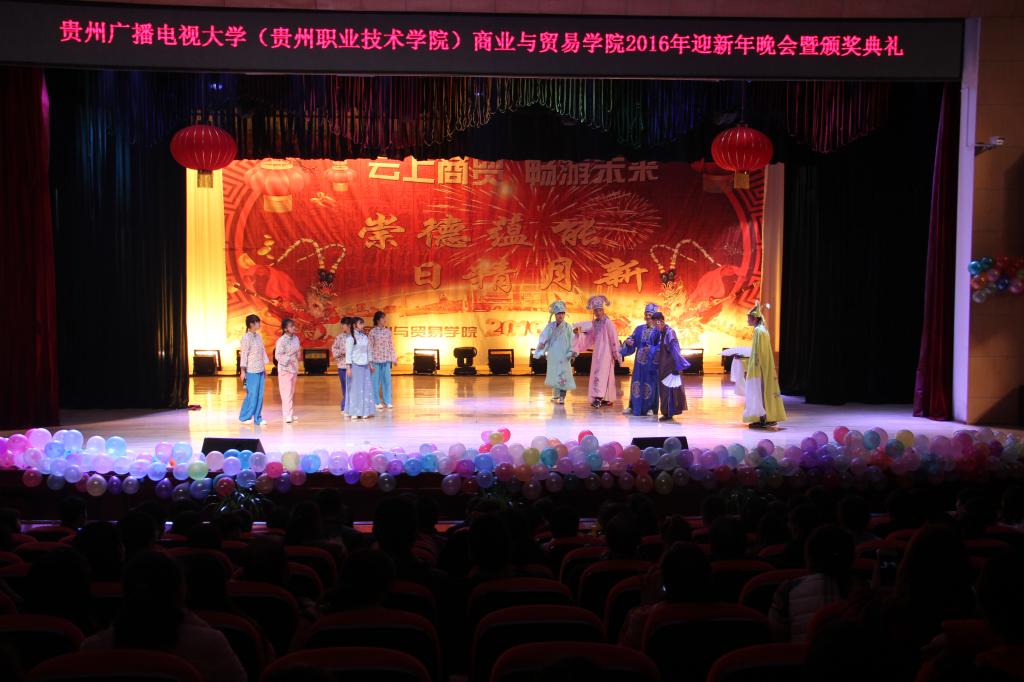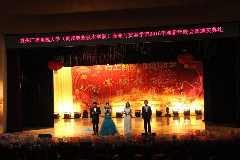 2016年12月22日19:30分,“云上商贸 畅想未来 崇德蕴能 日精月新”商贸学院2016年迎新年晚会暨颁奖典礼在大礼堂拉开序幕。此次晚会邀请到了学院党委书记邓惠宾老师,学院党委副书记袁仁庆老师,学院组织部部长张仁俊老师,学院团委副书记陈鹰老师;商贸学院党总支书记刘德刚,副主任赵霖带领全系教职工参加了此次晚会。