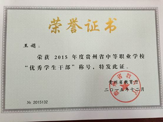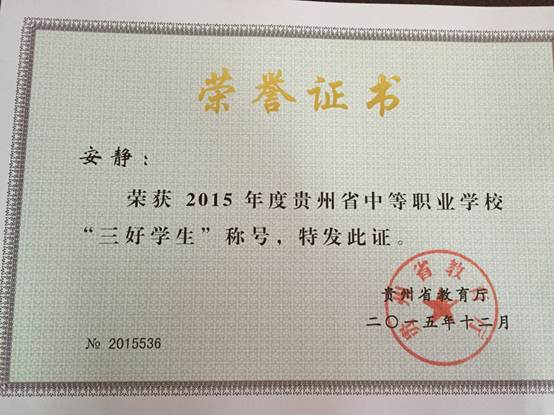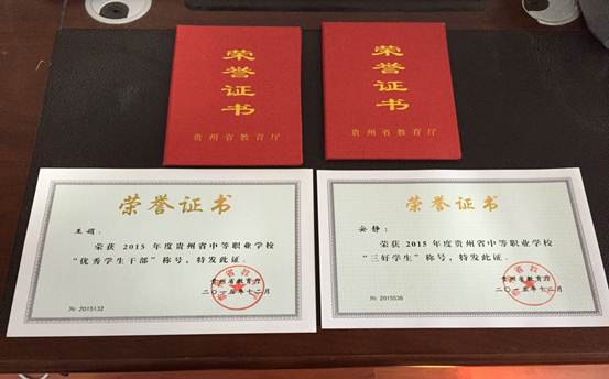 根据《省教育厅关于2015年全省普通高等学校中等职业学校三好学生优秀学生干部先进班集体评选结果的通报》(黔教学发[2015]289号),省教育厅日前颁发表彰荣誉证书。我校王娟同学获得省级“优秀学生干部”称号,安静同学获得省级“三好学生”称号。