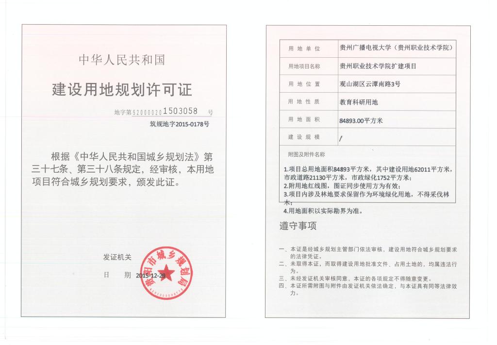 我校扩建用地《建设用地规划许可证》于2015年10月29日在贵阳市城乡规划局一站式服务平台网上申报系统进行报建,经贵阳市城乡规划局上报贵阳市政府进行规划定点手续办理,市政府市长办公会同意由贵阳市城乡规划局进行项目规划定点相关事宜的审核。经审核,贵阳市城乡规划局认为我校扩建用地项目符合城乡规划要求,同意按照教育科研用地性质颁发中华人民共和国《建设用地规划许可证》,并按项目《建设用地选址意见书》相关坐标制作该项目的用地红线图,项目红线内总用地面积84893平方米。至此,我校扩建项目将在省政府用地批复正式下发后进行规划总图报批手续。