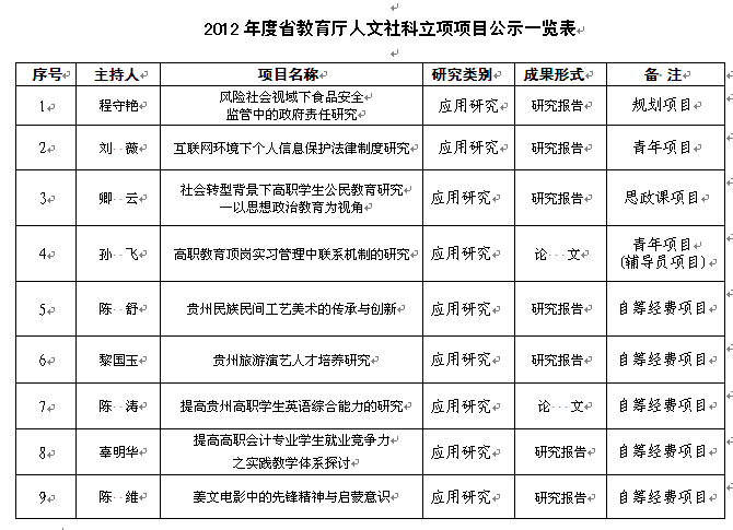 2012年,贵州职院科研处组织了省教育厅人文社科项目的申报。按教育厅限额申报的原则,校学术委员会初评推荐申报项目10项,经教育组织专家评审,我校9项申报课题获准立项,其中规划项目1项、青年项目1项、辅导员项目1项、思想政治课项目1项、自筹项目5项(立项项目见下表)。