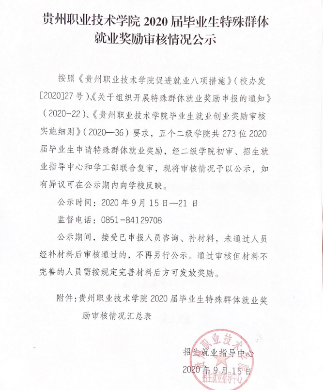 贵州职业技术学院2020届毕业生特殊群体就业奖励审核情况公示