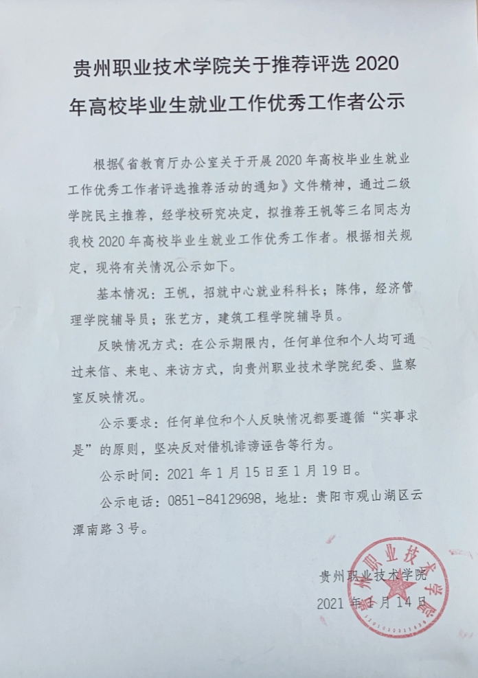 贵州职业技术学院关于推荐评选2020年高校毕业生就业工作优秀工作者公示