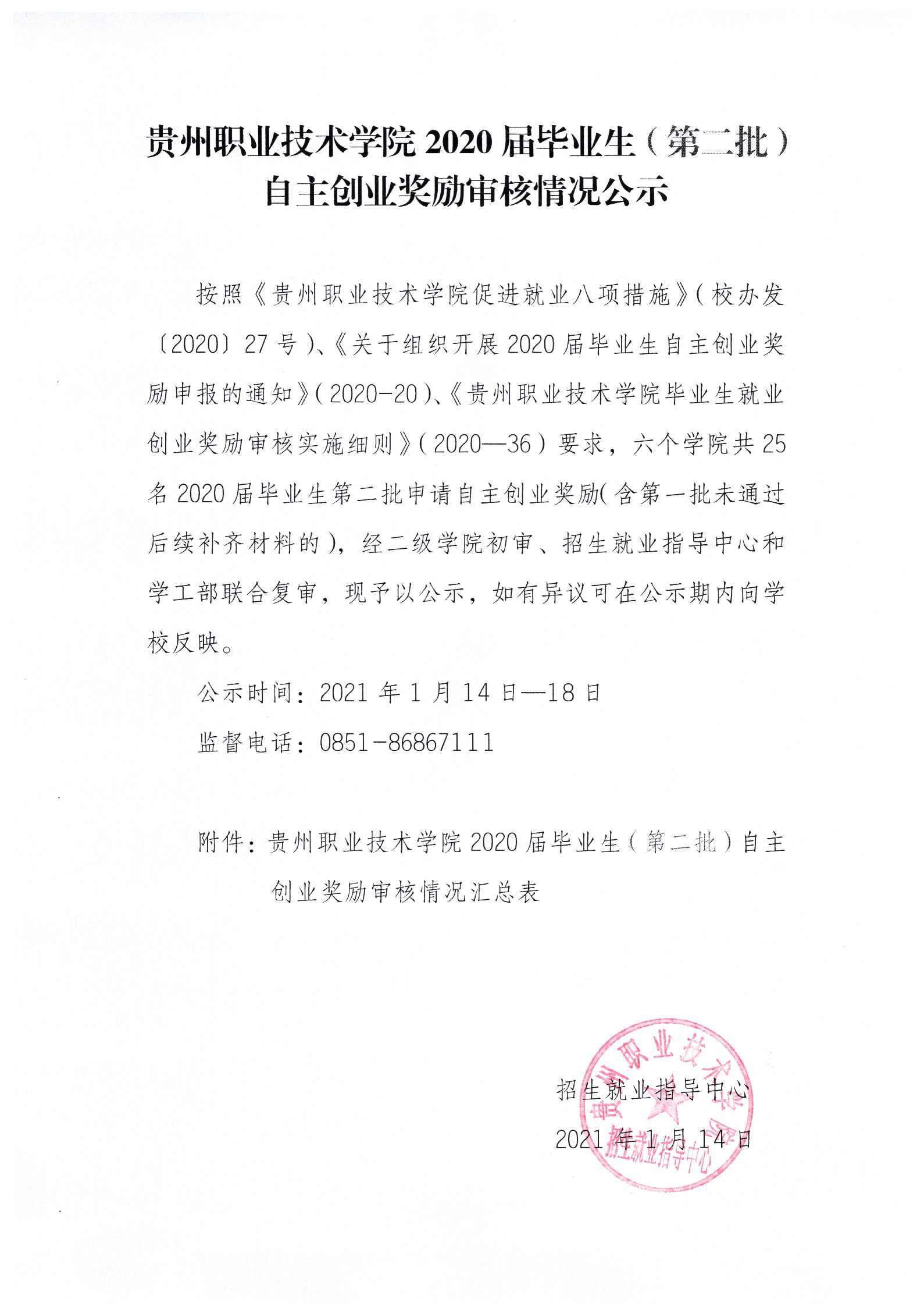 贵州职业技术学院2020届毕业生(第二批)自主创业奖励审核情况公示