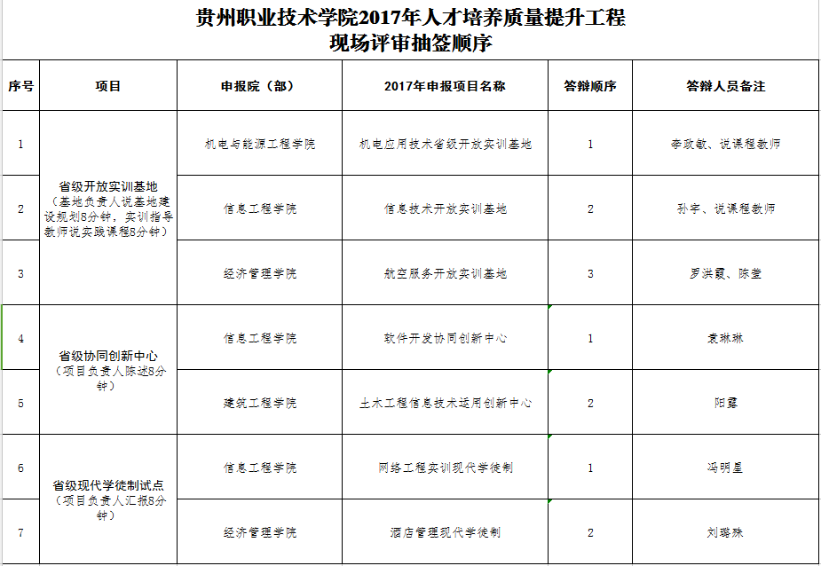 贵州职院2017年人才培养质量提升工程校内评审抽签顺序