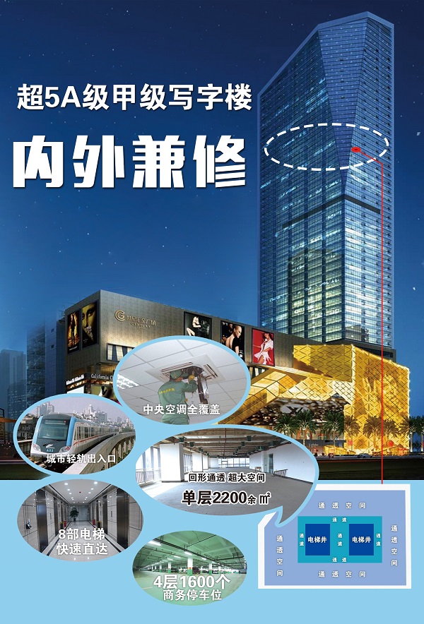 写字楼中央空调全覆盖,紧邻城市轻轨入口,8部电梯快速直达,4层1600个商务停车位。请有需求者与我校联系。