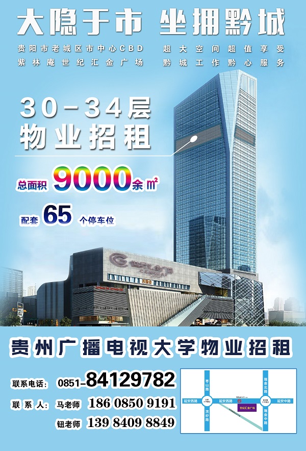 该物业位于贵阳市延安西路汇金国际广场塔楼第30、31、32、33、34层,总面积约9千余平方米,配套65个停车位。单层面积约2千余平方米,回形超大空间。