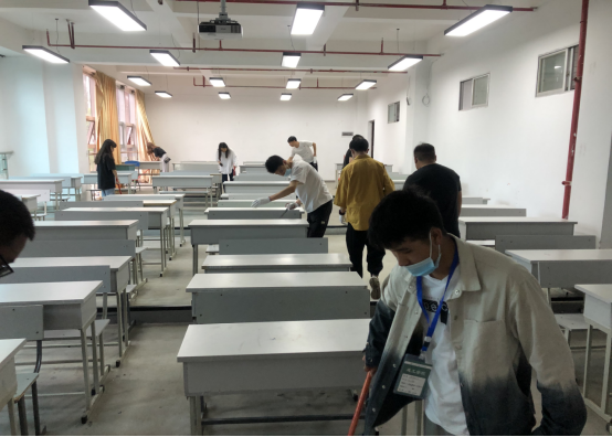 各专业返校学生下午14点30分准时在科研楼门口集合。在建工学院朱立和何孟芹两位老师的带领下,分配负责区域并分发劳动工具。朱立老师强调各专业同学要分工合作、密切配合,对负责区域卫生死角进行彻底清理。