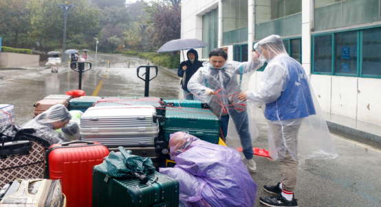 随着雨越下越大,志愿者们超负荷工作,人手开始紧张,现场指挥的老师不得不在班级群现场招募志愿者。一呼百应,这时候物流专业的同学们发挥专长,拖着他们教学用的专业的手推叉车,在老师的带领下出现在校门口,商贸学院的行李一个叉车拉着几十个行李,直接送到宿舍楼下,由老师带队看管行李,大大减轻了志愿者工作量,节省了人力,也保护了行李不被淋湿。商贸学院的“硬核”迎新吸引来不少的目光,也赢得了新生的赞扬:“虽然爸妈不能陪我进校园,但是学长学姐就像哥哥姐姐一样,我们感觉很温暖,看到老师们也都跟着被淋湿了,真的很感动”。